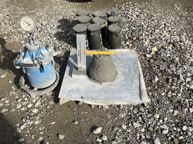 1. スランプ(柔らかさ): 専用のコーンに生コンを詰め、コーンを引き上げた時にどれだけ下がったかを測ります。数値が大きいほど柔らかく、施工しやすくなりますが、強度のバランスが重要です。