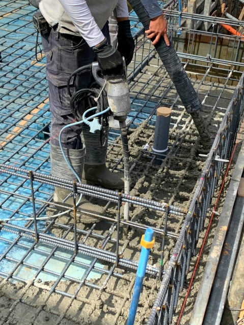 • バイブレーターの基本: コンクリートを流し込んだ後、振動を与えて空気を抜き、隅々まで生コンを行き渡らせます。